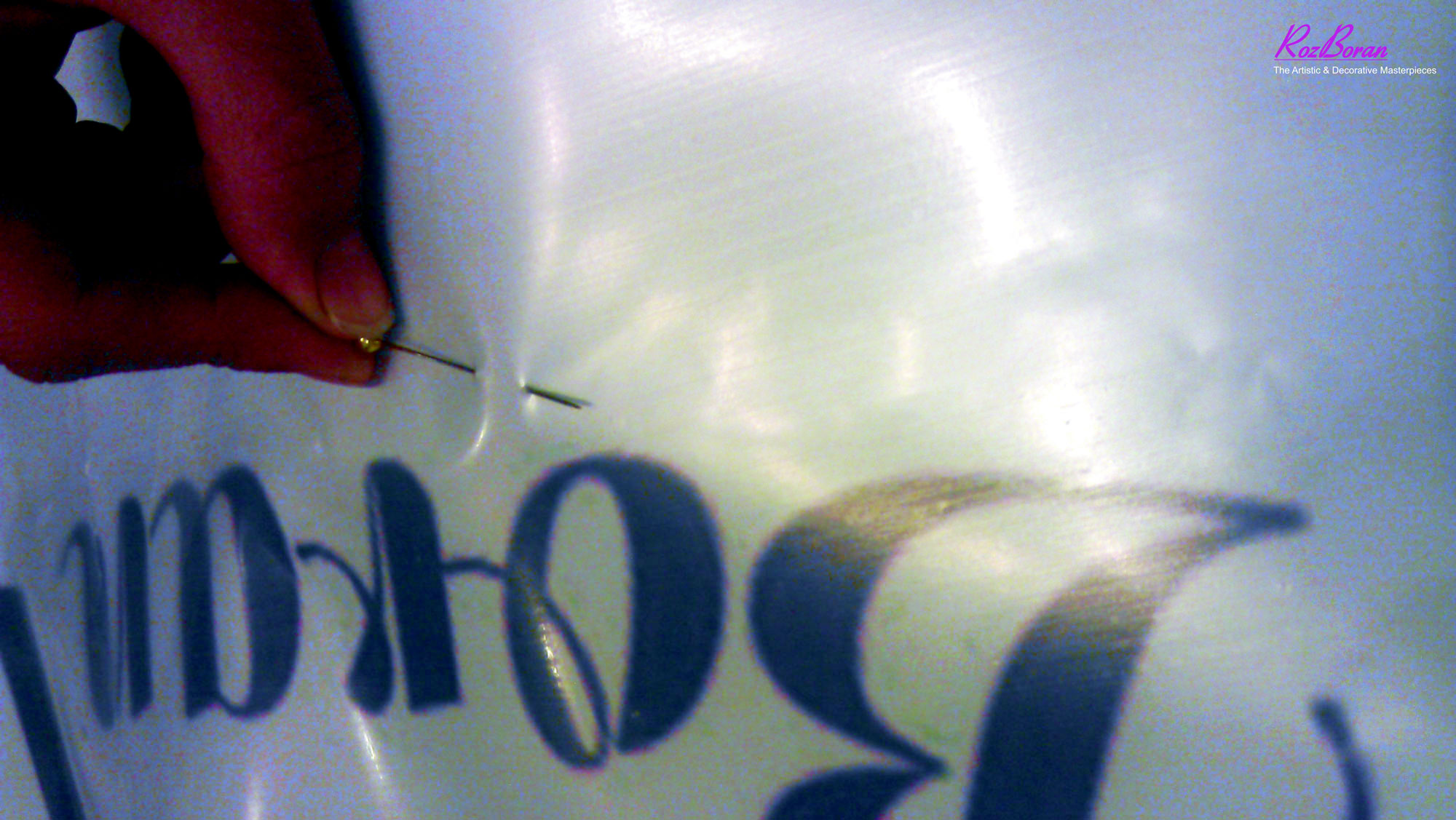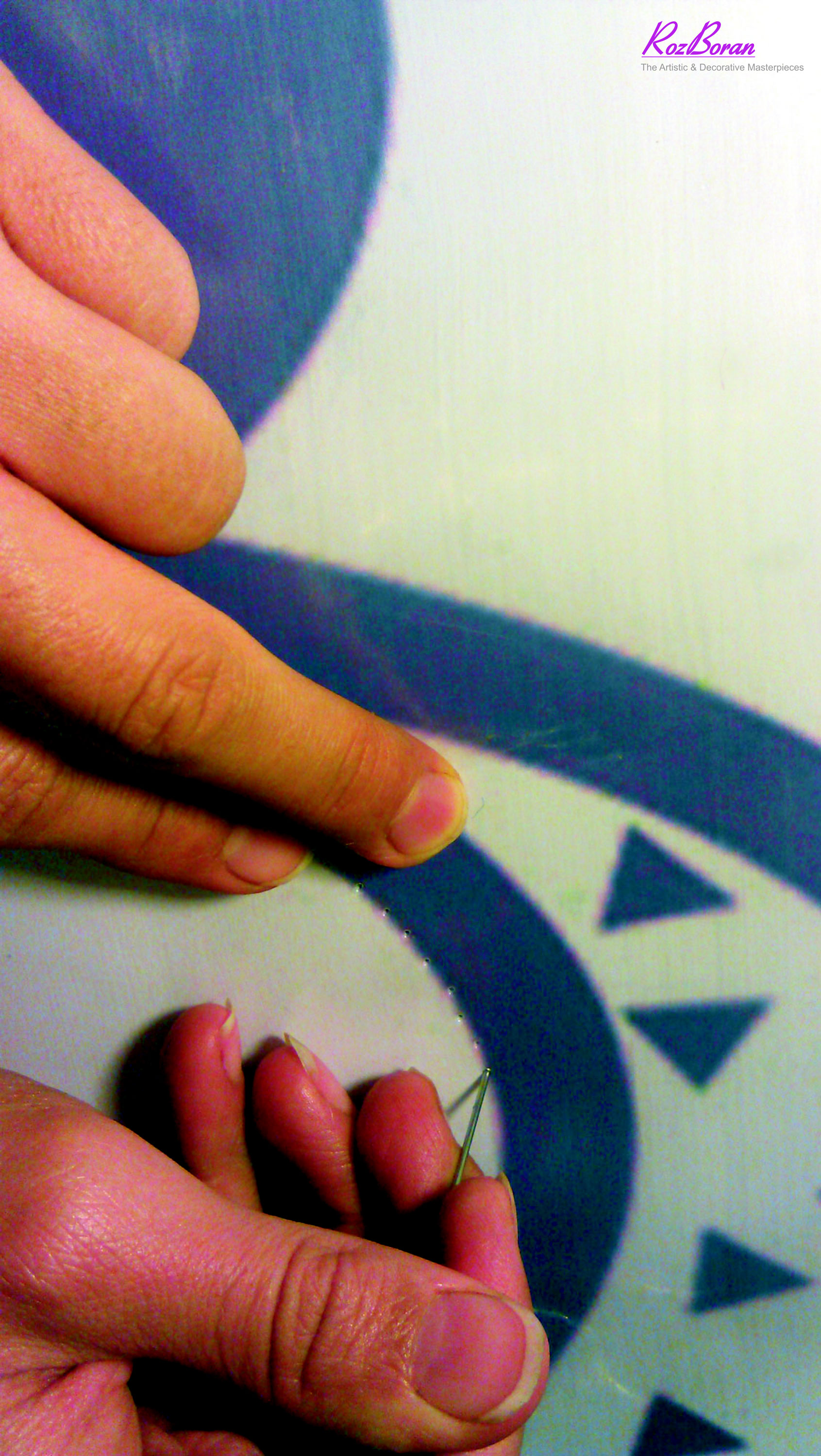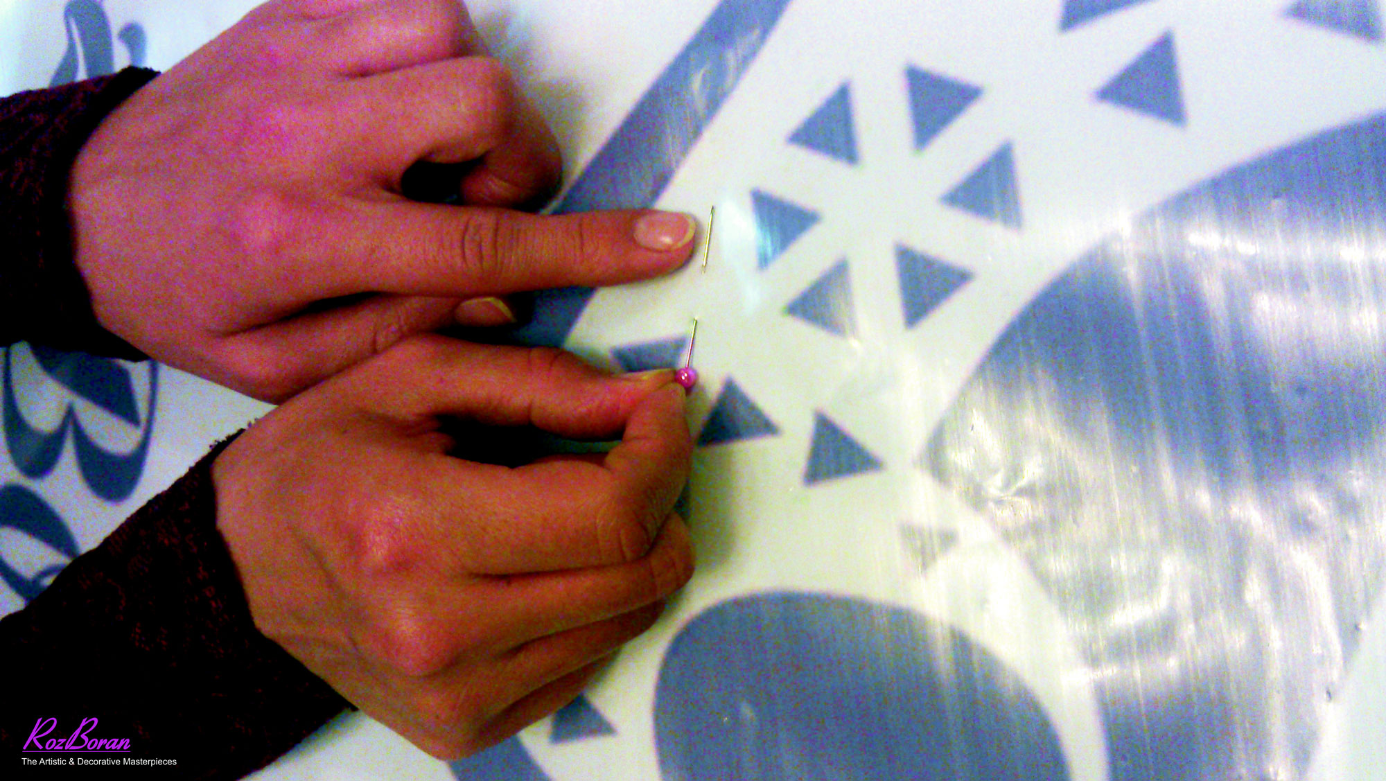 چرا این کار را می کنیم؟ سطح گچی که قرار است ما این طرح را روی آن اجرا کنیم دارای رطوبت است و اگر برای پیاده کردن، کاغذ را روی آن قرار دهیم رطوبت جذب کاغذ شده و کاغذ خراب می شود. ما پلاستیک را روی کاغذ کشیده و می خواهیم دقیقاً عین طرح را با درفش سوزنی سوراخ سوراخ کنیم. پس از پایان این کار،این پلاستیک سوراخ سوراخ است که به عنوان شابلون طرح اصلی روی گچ مرطوب قرار می گیرد.