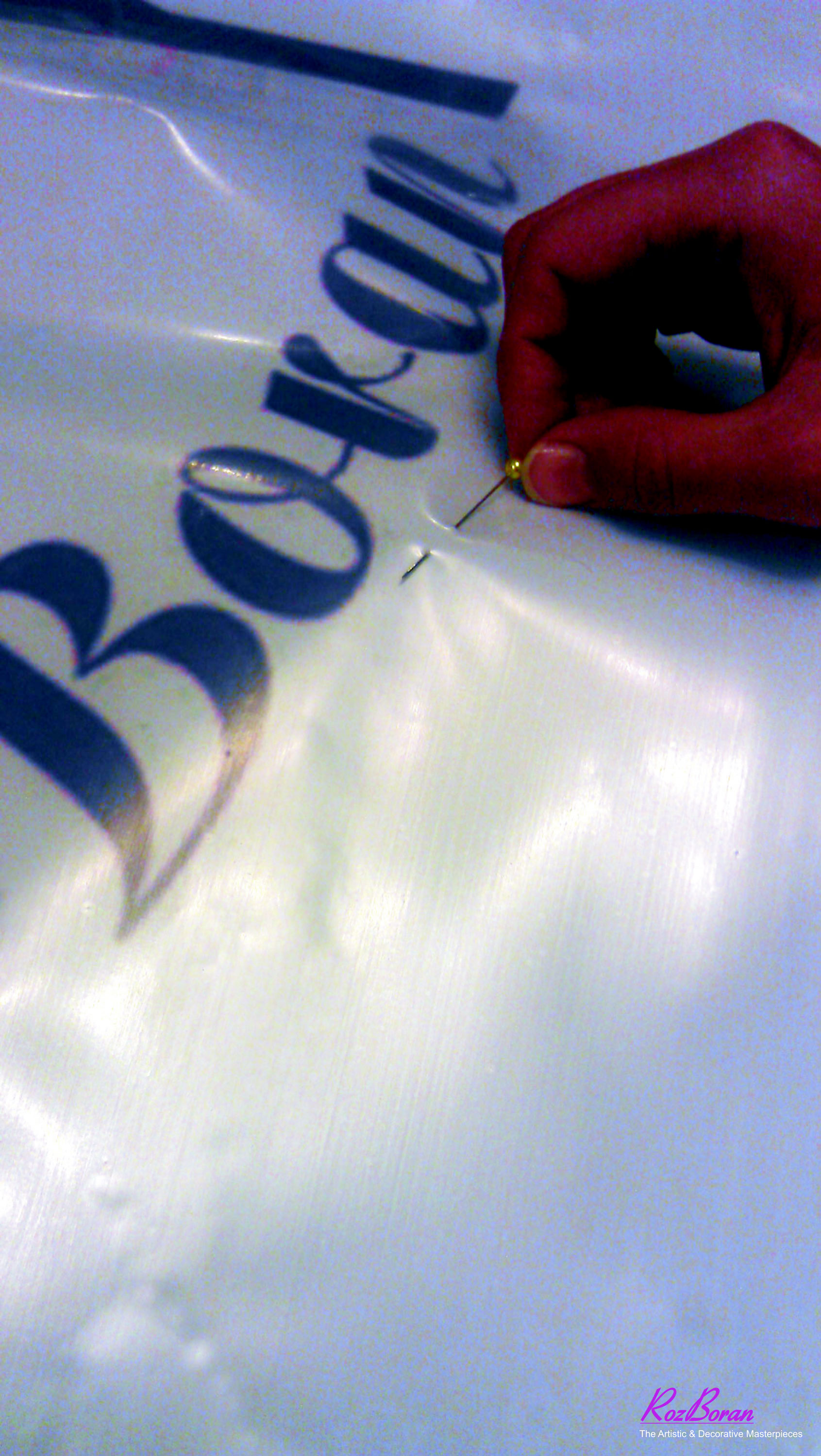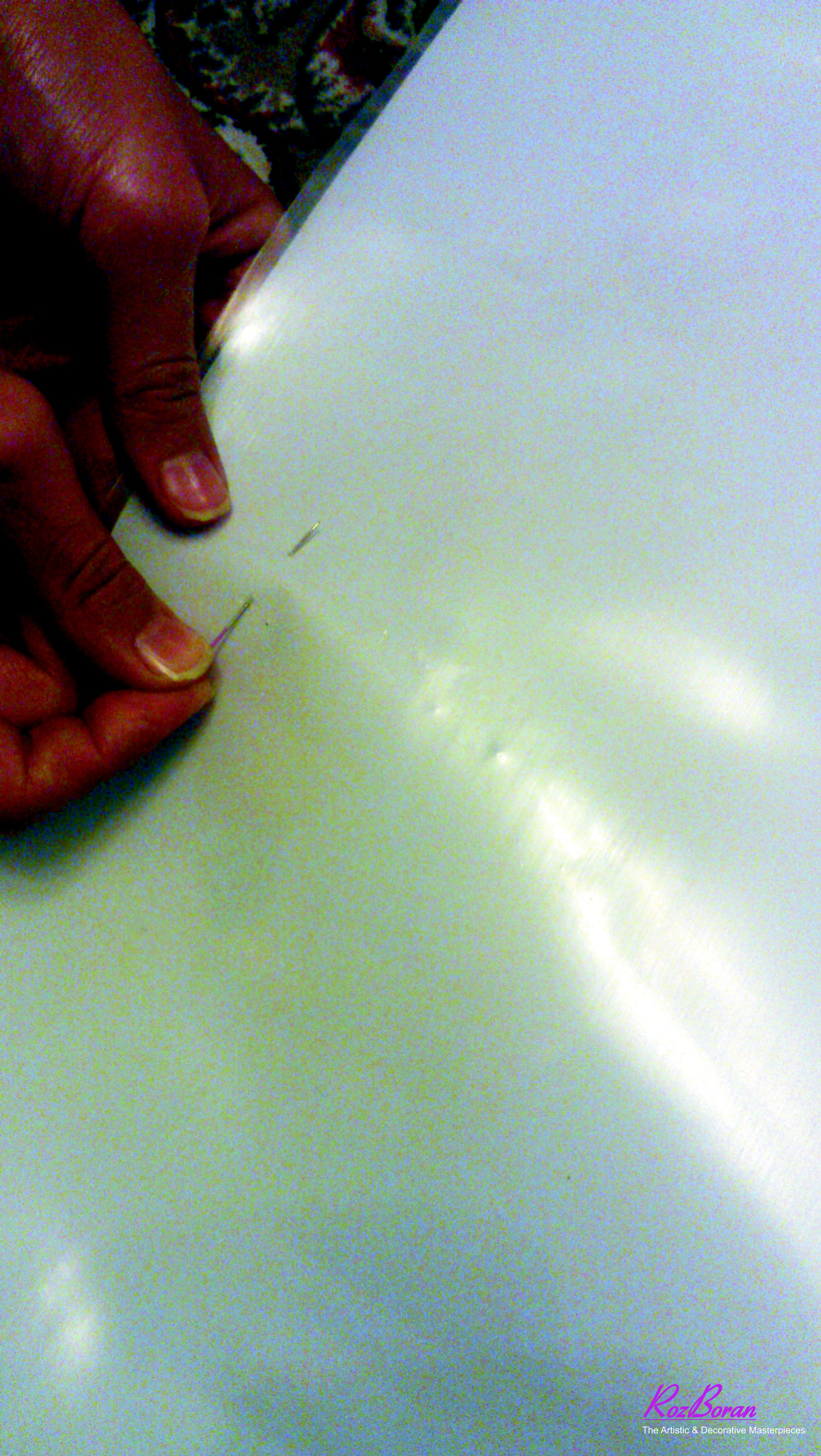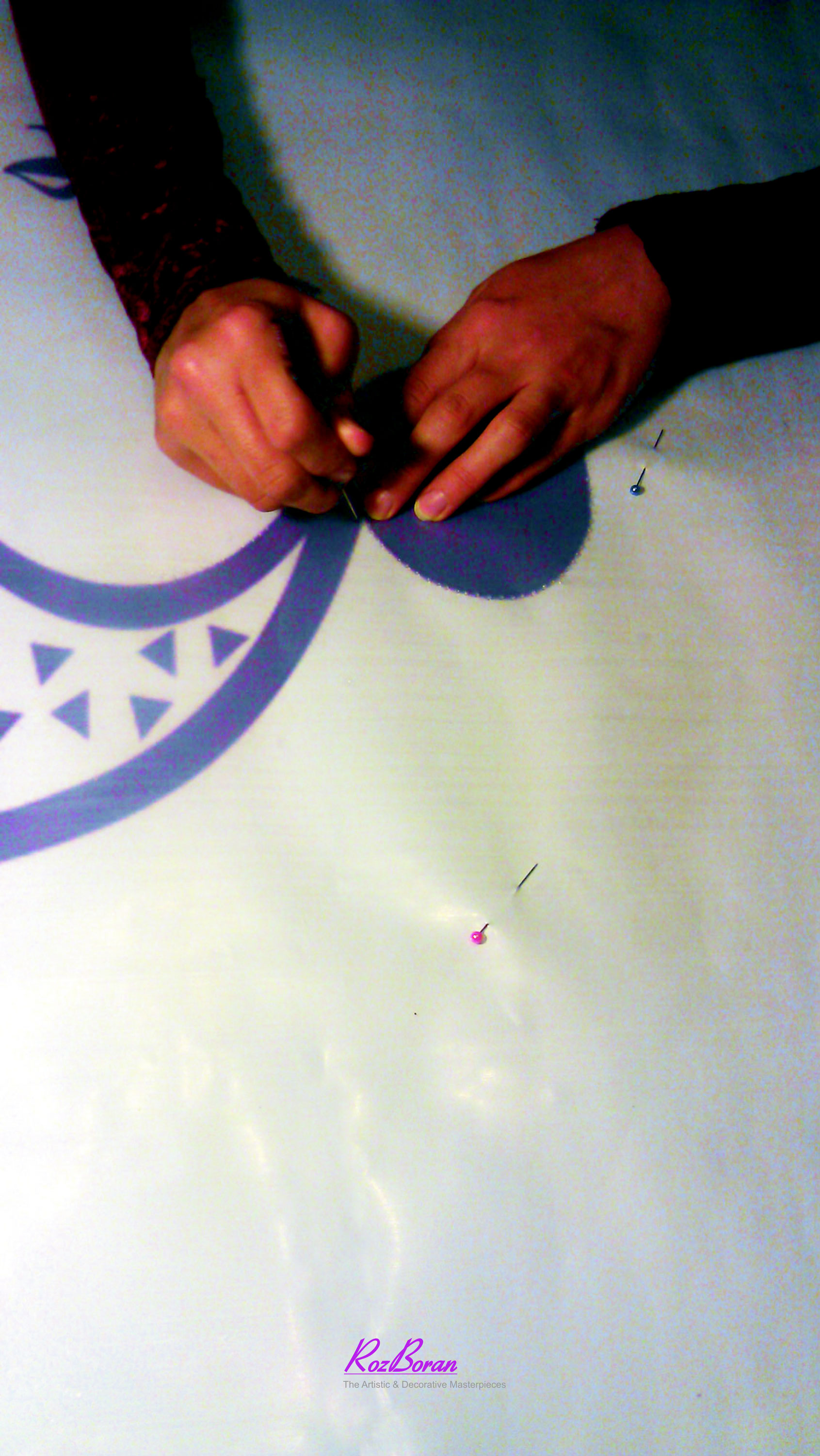 چرا این کار را می کنیم؟ سطح گچی که قرار است ما این طرح را روی آن اجرا کنیم دارای رطوبت است و اگر برای پیاده کردن، کاغذ را روی آن قرار دهیم رطوبت جذب کاغذ شده و کاغذ خراب می شود. ما پلاستیک را روی کاغذ کشیده و می خواهیم دقیقاً عین طرح را با درفش سوزنی سوراخ سوراخ کنیم. پس از پایان این کار،این پلاستیک سوراخ سوراخ است که به عنوان شابلون طرح اصلی روی گچ مرطوب قرار می گیرد.